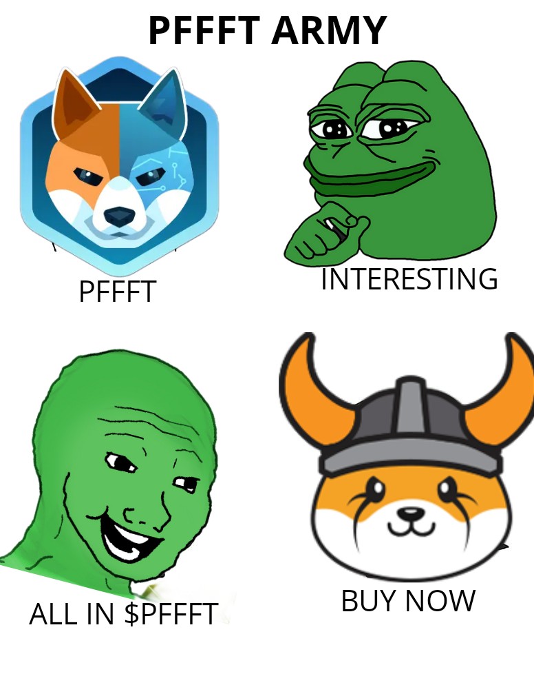 Memecoins have gained a lot of popularity and attention from the crypto community in recent years, driven by the rise of meme culture and the success of meme-based tokens such as Dogecoin, AiDoge, PEPE, WOJACK or FLOKI. $PFFFT Token is entering the market at a time when memecoins are at their peak, which provides an opportunity for the token to gain traction and potentially rise in value.
